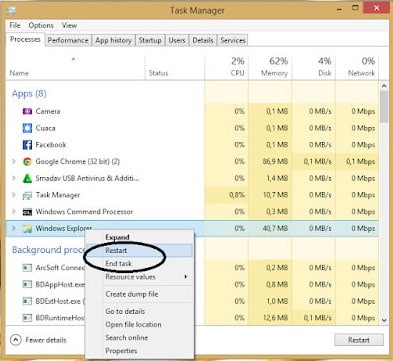 Langkah pertama, buka “Task Manager” dengan tekan Ctrl + Alt + Del. Lalu cari Windows Explorer klik kanan dan pilih Restart atau End Task.