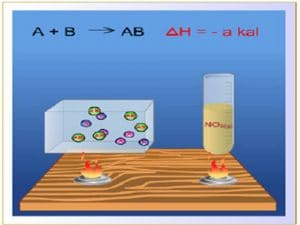 Reaksi ke kananpada reaksi kesetimbangan di atas merupakan reaksi eksoterm. Kebalikannya, reaksi ke kiri merupakan reaksi endoterm. Persamaan reaksi kesetimbangannya menjadi: