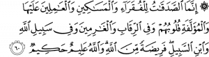 Artinya: “Sesungguhnya zakat-zakat itu hanyalah untuk orang-orang fakir, orang-orang miskin, pengurus-pengurus zakat, para mualaf yang dibujuk hatinya (memerdekakan budak), orang- orang yang berhutang, untuk perjuangan di jalan Allah, dan orang-orang yang sedang dalam perjalanan sebagai sesuatu ketetapan yang diwajibkan Allah, dan Allah Maha Mengetahui lagi Mahabijaksana.” (QS At Taubah: 60).